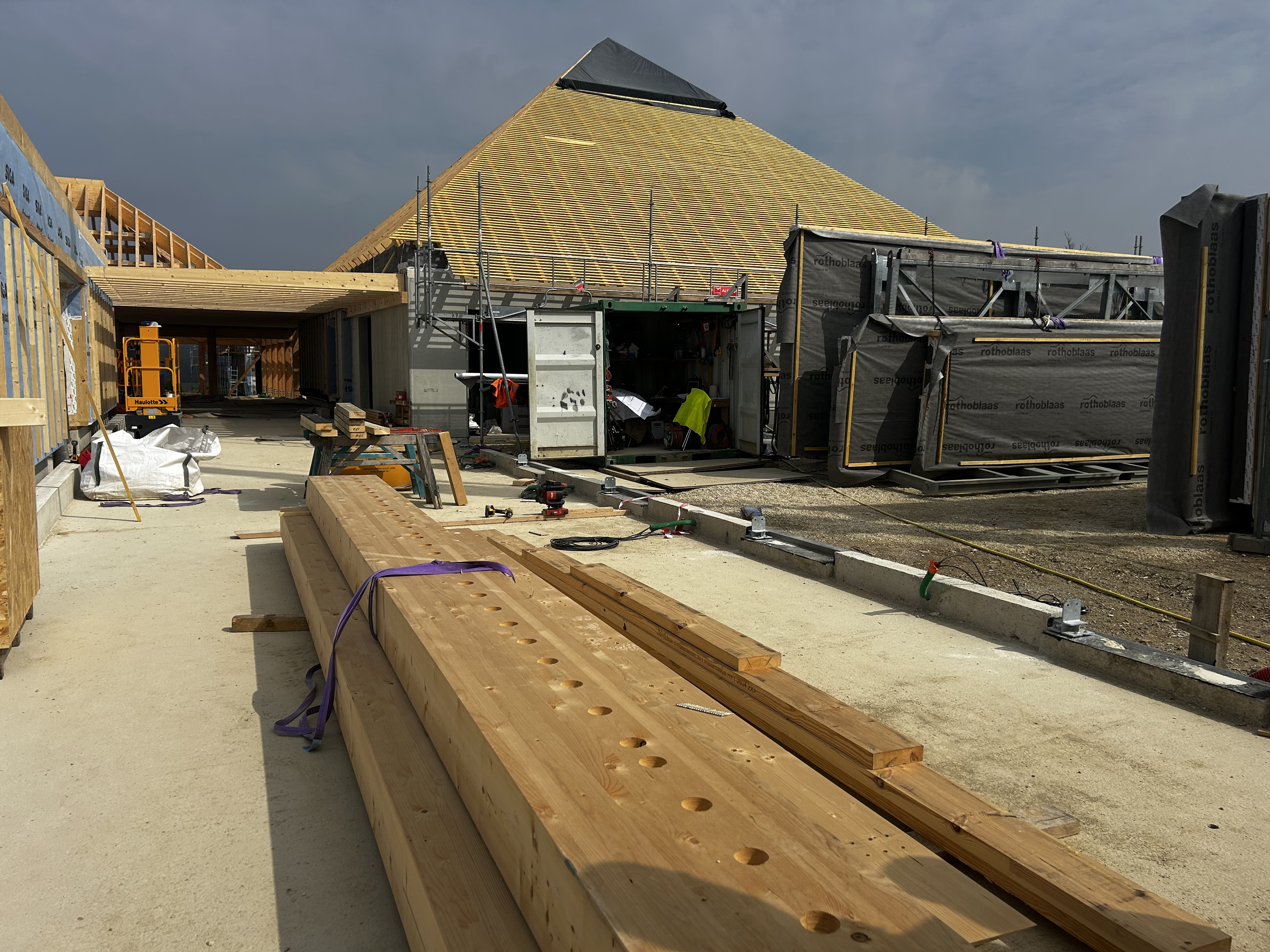 Les pavillons (15×15 m) sont construits avec des matériaux naturels, biosourcés et locaux : ossature bois et paille, pierres locales, toitures en tuiles ardennaises, menuiseries en bois, zinc pour les toitures. Ils sont disposés sur le point culminant du village, offrant des vues sur les environs.